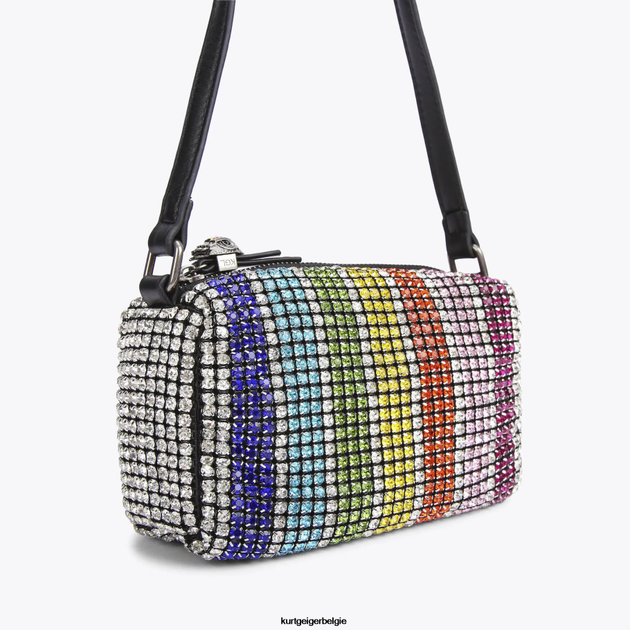 Deze feestpochette is gemaakt van een stof met daarop veelkleurige kristallen, waardoor de kenmerkende regenboog ontstaat. de antieke zilveren adelaarskop is voorzien van regenboogkleurige kristallen en zwarte kristallen ogen op de ritssluiting.