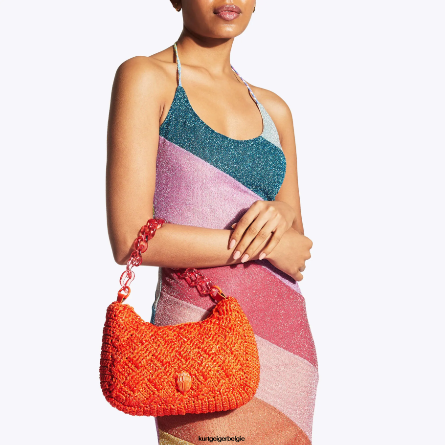 De gehaakte multi-crossbody is gemaakt van een metallic garen dat in een weefpatroon is geweven. de oranje adelaarskop is helemaal voorzien van veren op de voorkant.
