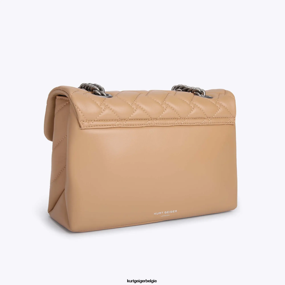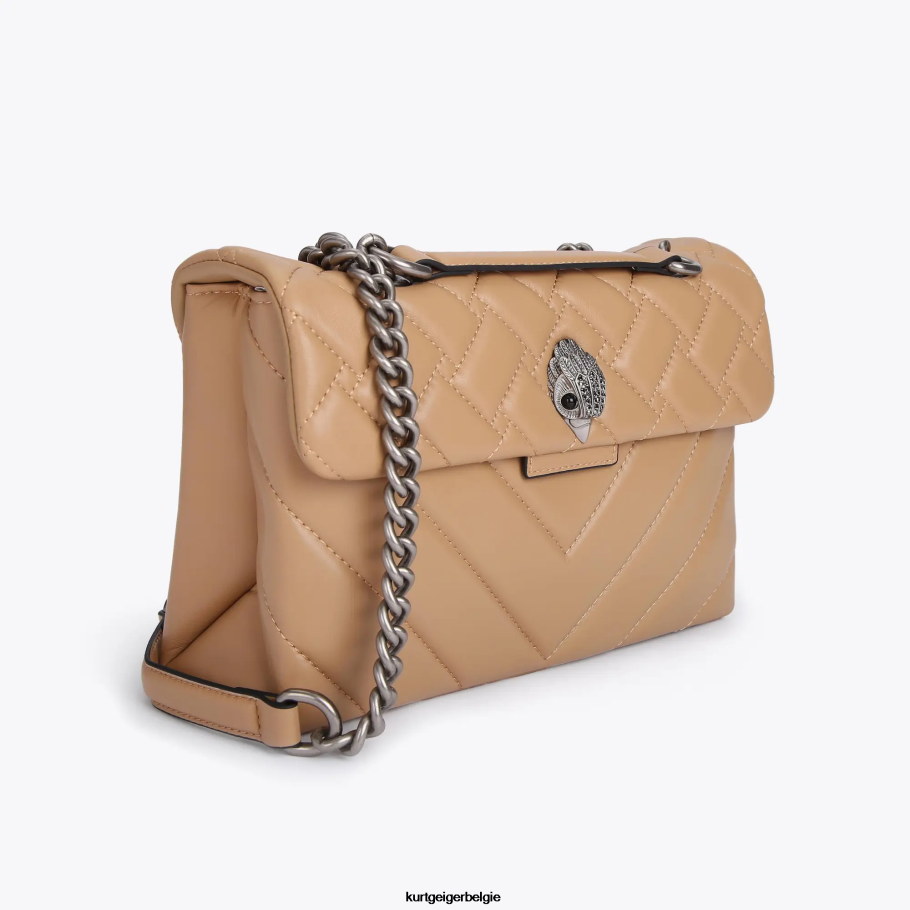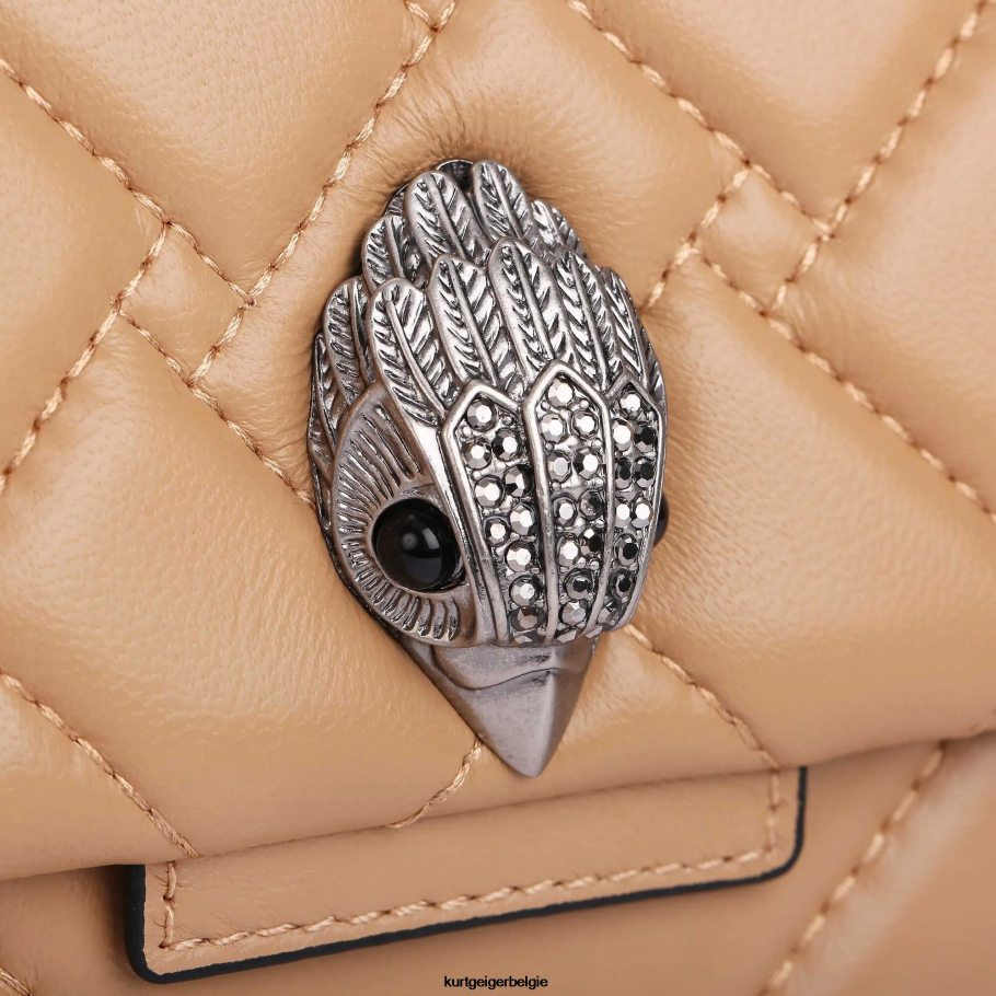 De Kensington-portemonnee is gemaakt van luxueus kamelenleer en heeft afwisselend stiksel aan de voorkant, gunmetal details op de kettingriem en een iconische versiering van een adelaarskop met juwelen. zwart gevoerde binnenkant met twee gescheiden compartimenten.