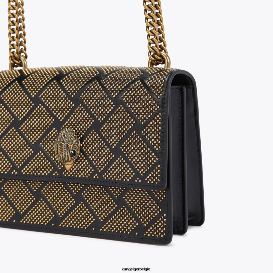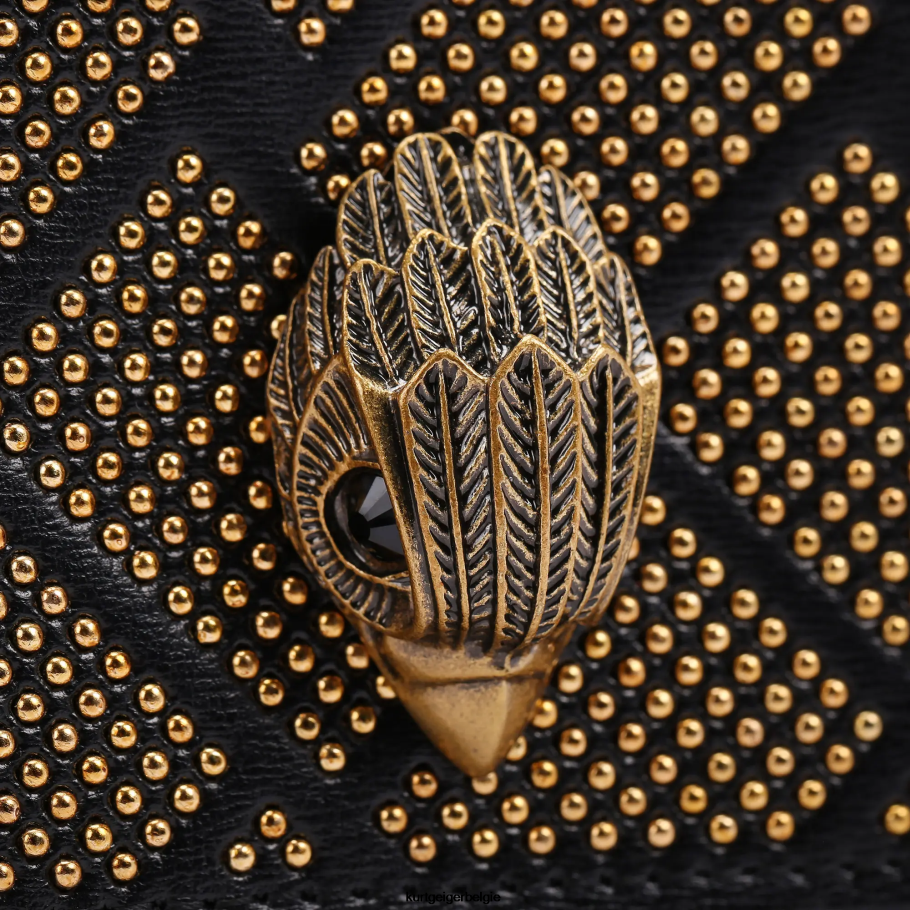 De shoreditch crossbody is gemaakt van zwart leer met structuur. de voorflap is afgewerkt met gouden studs in een quilteffect en een antieke koperen adelaarskop met all-over verendetails.