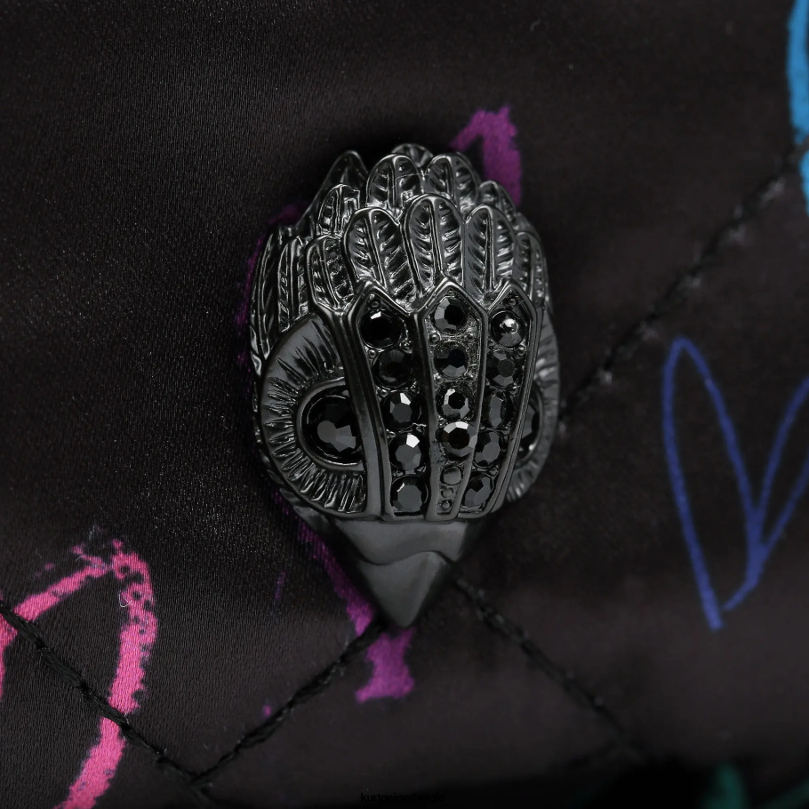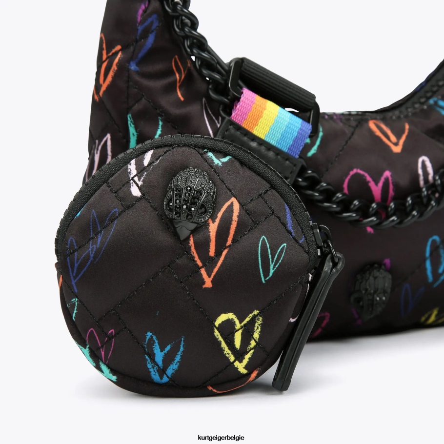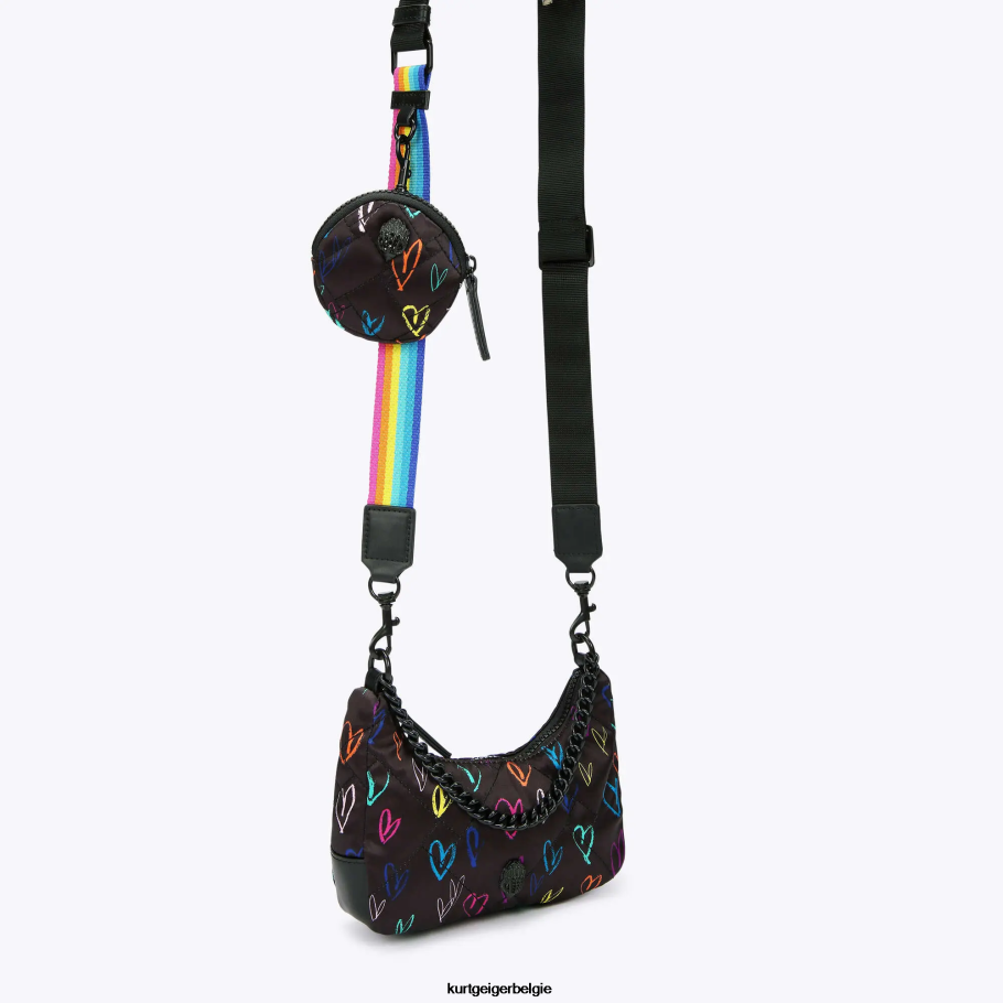 De gerecyclede kleine multi-crossbody is gemaakt van gerecycled nylonmateriaal met doorgestikte stiksels in een weefpatroon. er is een handgetekende meerkleurige hartenprint. de zwarte adelaarskop is voorzien van kristallen en zwarte kristallen ogen aan de voorkant.