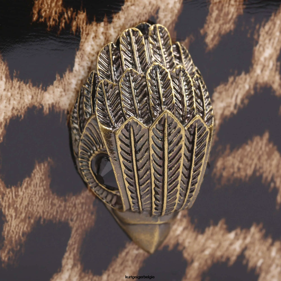 De kleine Shoreditch cameratas is gemaakt van lakleer met luipaardprint. de voorkant is afgewerkt met een koperen adelaarskop met all-over veren en kristallen ogen.