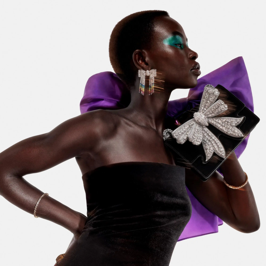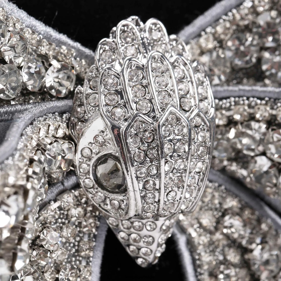 De kleine shoreditch crossbody is gemaakt van zacht zwart fluweel. de voorflap is afgewerkt met een met kristallen versierde strik met in het midden een zilveren adelaarskop.