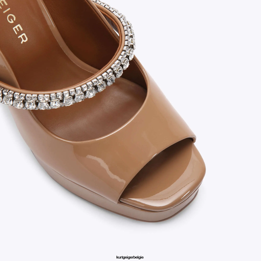 De Duke platform peep toe heeft een bovenwerk van camellakleer. de teen is open en er zit een met kristallen versierde band over de voet.