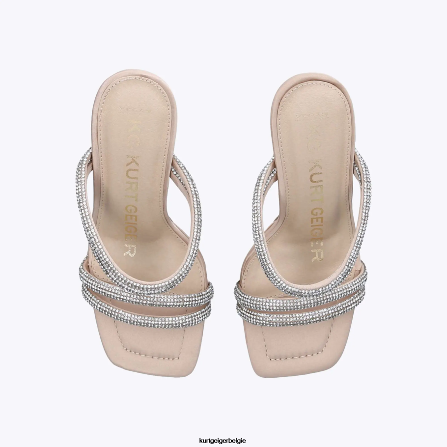 de uitlopende hak heeft een blozen satijnen bovenwerk met vier met kristallen versierde bandjes over de voet. de hoge hak is gebogen.