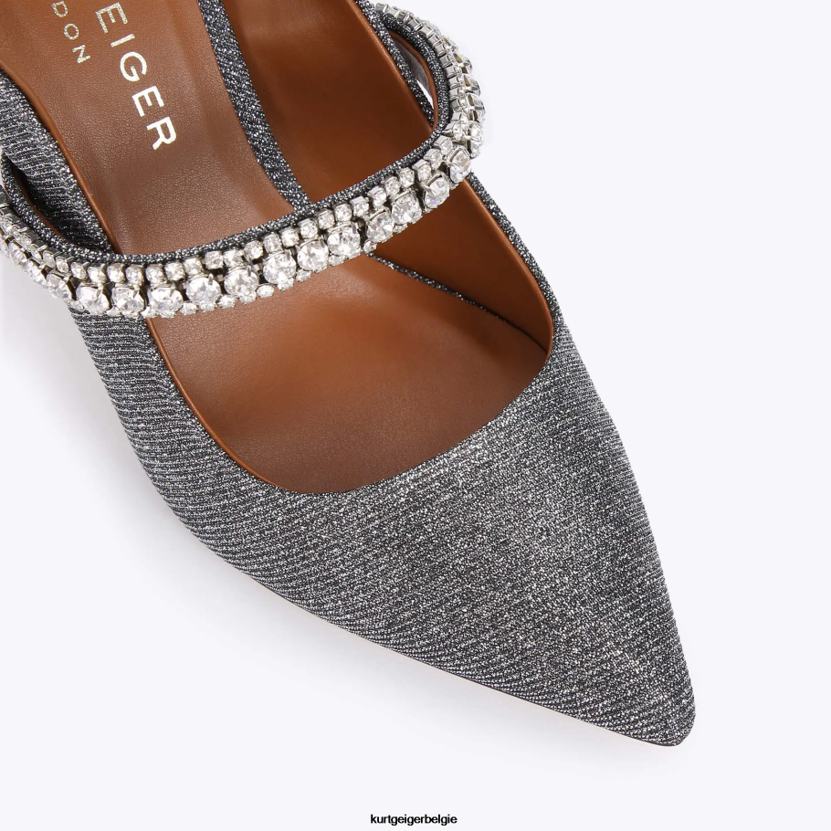 De Duke-muiltjeshak is gemaakt van een zilveren glitterstof met gesloten neus. het bandje over de voet is bedekt met zilveren juwelen.