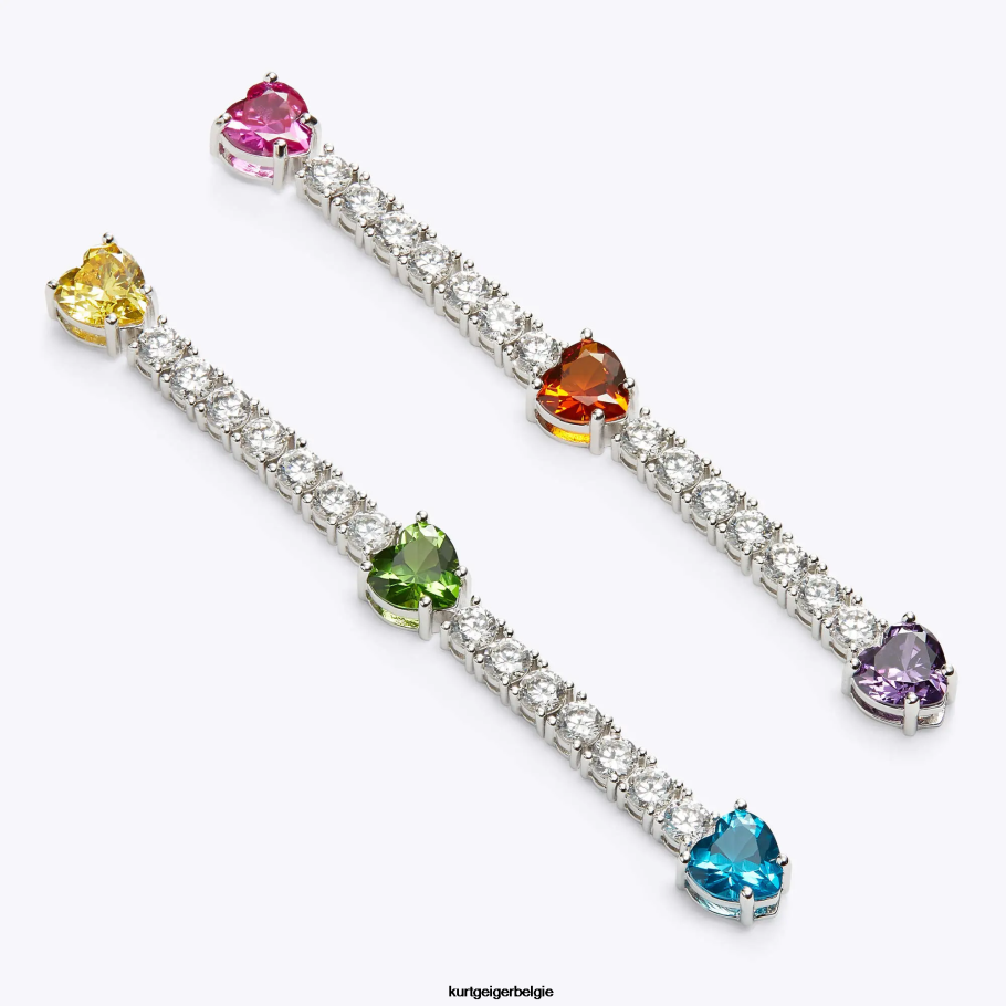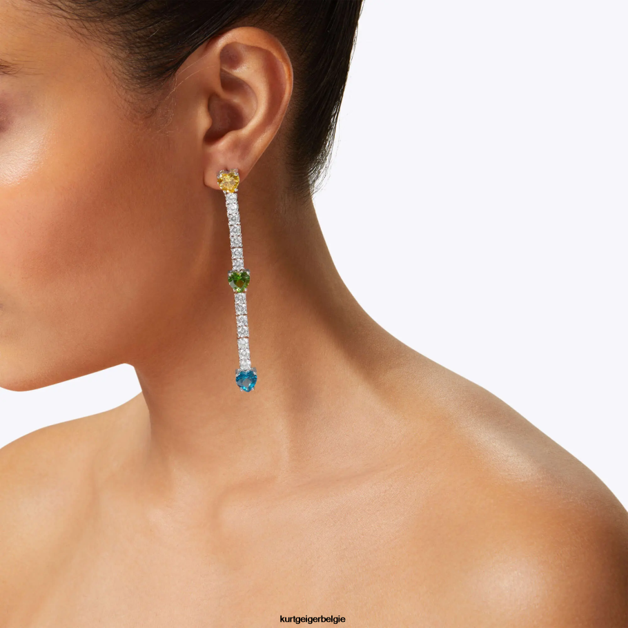 de hartvormige lineaire oorbellen zijn druppelvormig met zilveren kristallen, gescheiden door veelkleurige hartkristallen.