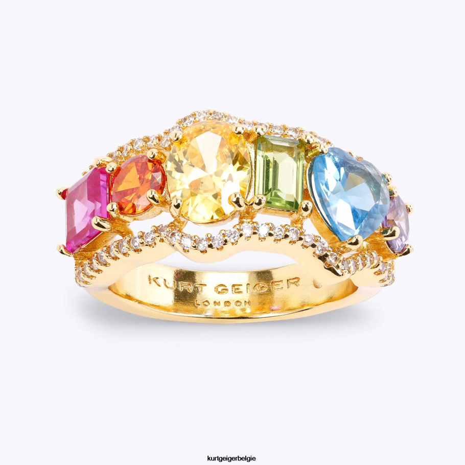de regenboogmixring is gemaakt met een eenvoudige goudkleurige band met daarop regenboogkristallen in ovale, stokbrood- en hartvormen. de ring is omgeven door zilveren microkristallen.