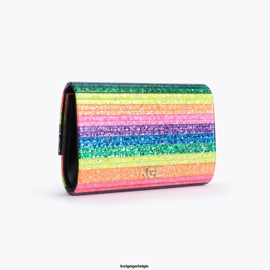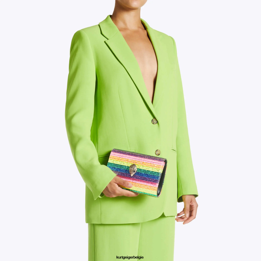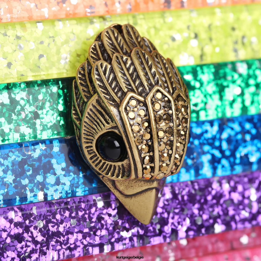 de party eagle clutch is gemaakt van flexibele perspex panelen met glitterdetails. de antieke koperen adelaarskop is voorzien van ondoorzichtige koperen kristallen en zwarte kraalogen op de voorflap.