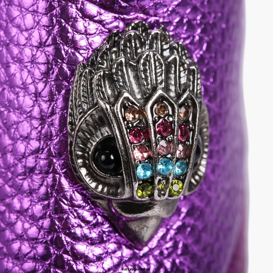 De regenboog Kensington-laars, een toevoeging aan de iconische Kensington-collectie, is gemaakt van metallic gelamineerd kalfsleer met kiezelnerf en een iconisch ingenaaid regenboogstreeppatroon. de laars is voorzien van een klein, antieke zilveren adelaarskop.