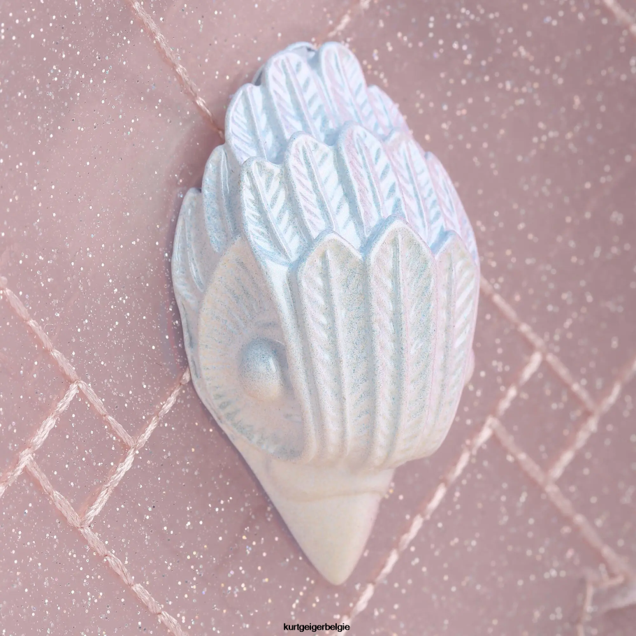 De glitter mini Kensington is gemaakt van metallic gelamineerd rundleer met kiezelkorrels in het iconische diagonale regenbooggenaaide streeppatroon, bekleed met ondoorzichtige zilveren kristallen. de roze adelaarskop past op de voorflap.