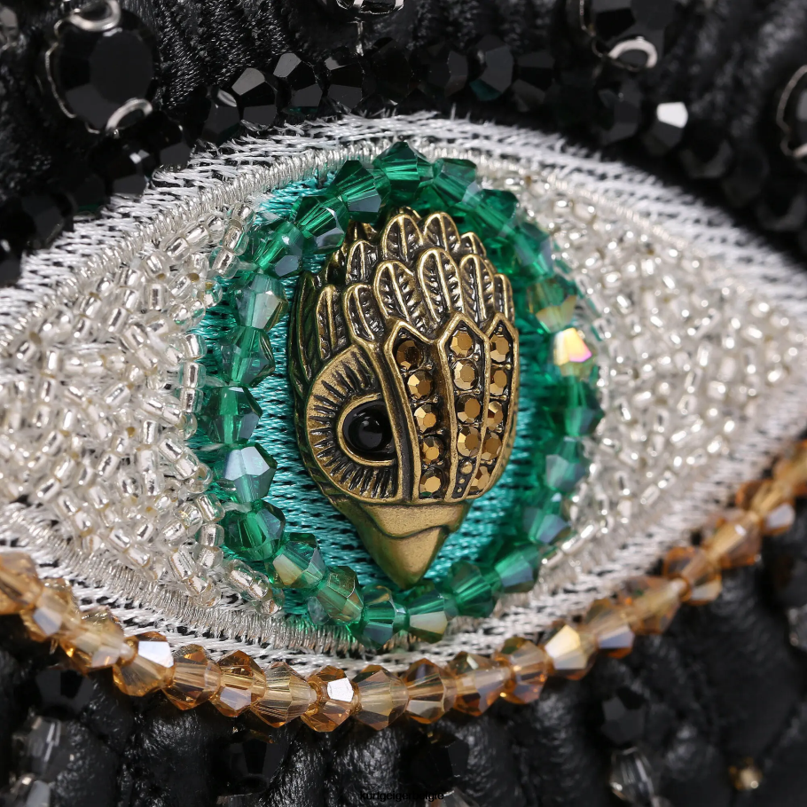 Het leren mini-kensington-oog is gemaakt van lamsleer met overstitch-quilting, waarbij zowel geweven als chevron-patronen worden gecombineerd. de antieke koperen adelaarskop met ondoorzichtige koperen kristallen zit in een kristallen oogmotief.
