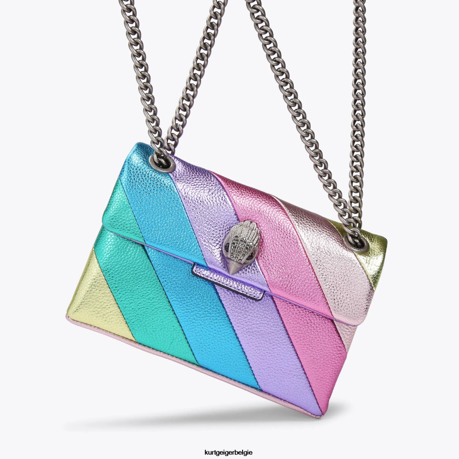 De leren mini Kensington-portemonnee is gemaakt van pastel metallic gelamineerd kiezelnerf rundleer met het iconische diagonale, opgenaaide regenboogstreeppatroon. de antieke zilveren adelaarskop is voorzien van ondoorzichtige zilveren kristallen en zwarte kraalogen op de voorflap.