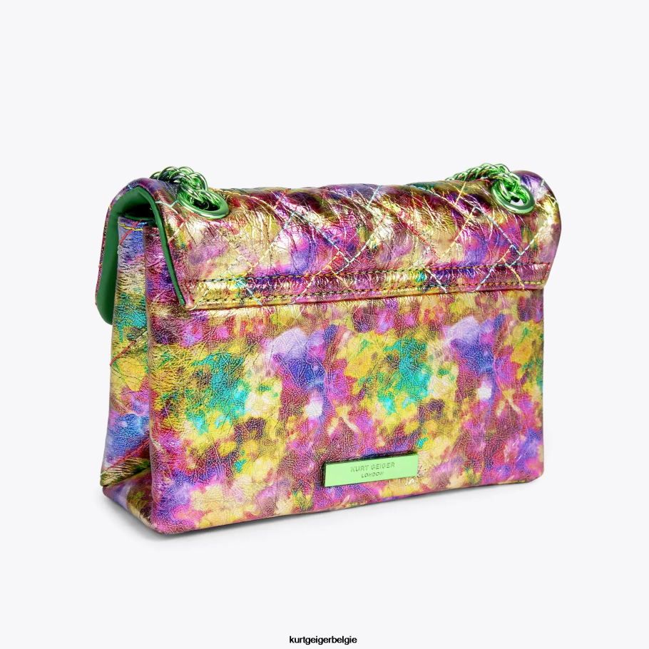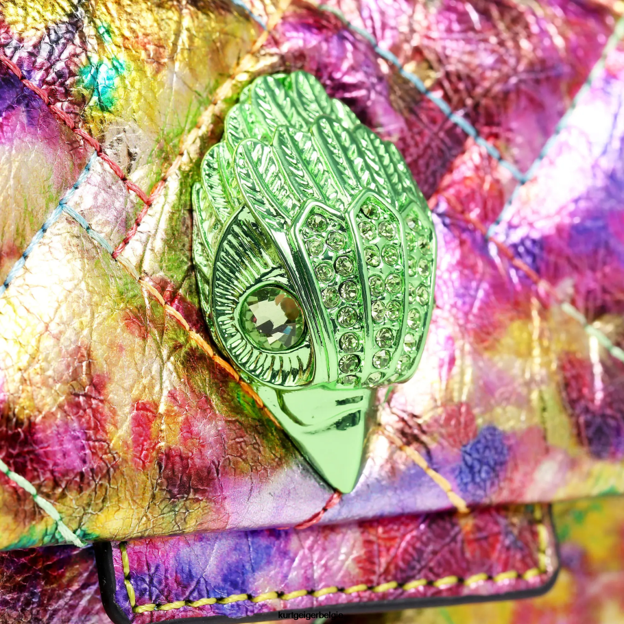 De leren mini-kensington is gemaakt van leer met een metallic zuurprint en een kenmerkende parketgevoerde overstitch-quilt met drie rijen weefpatroon. de groene adelaarskop is voorzien van kristallen op de voorflap.