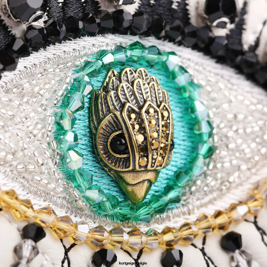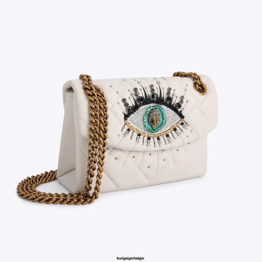 Het leren mini Kensington-oog is gemaakt van lamsleer met overstitch-quilting, waarbij zowel geweven als chevron-patronen worden gecombineerd. de antieke koperen adelaarskop met ondoorzichtige koperen kristallen zit in een kristallen oogmotief.