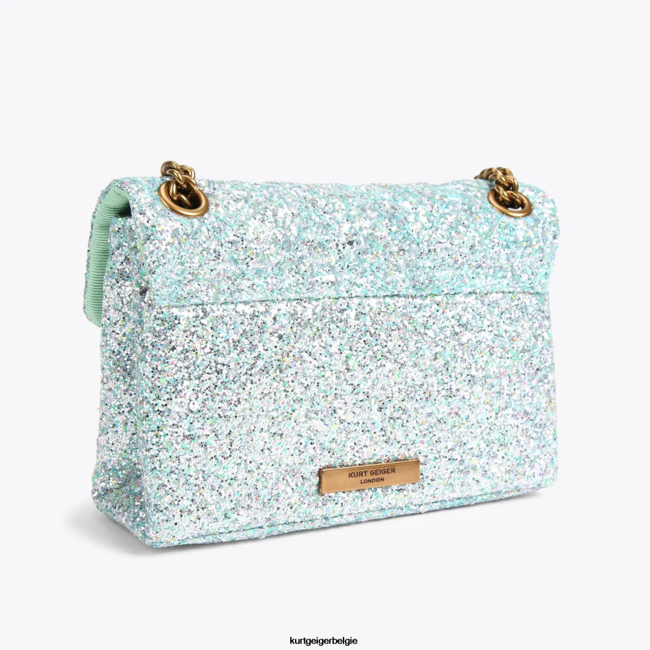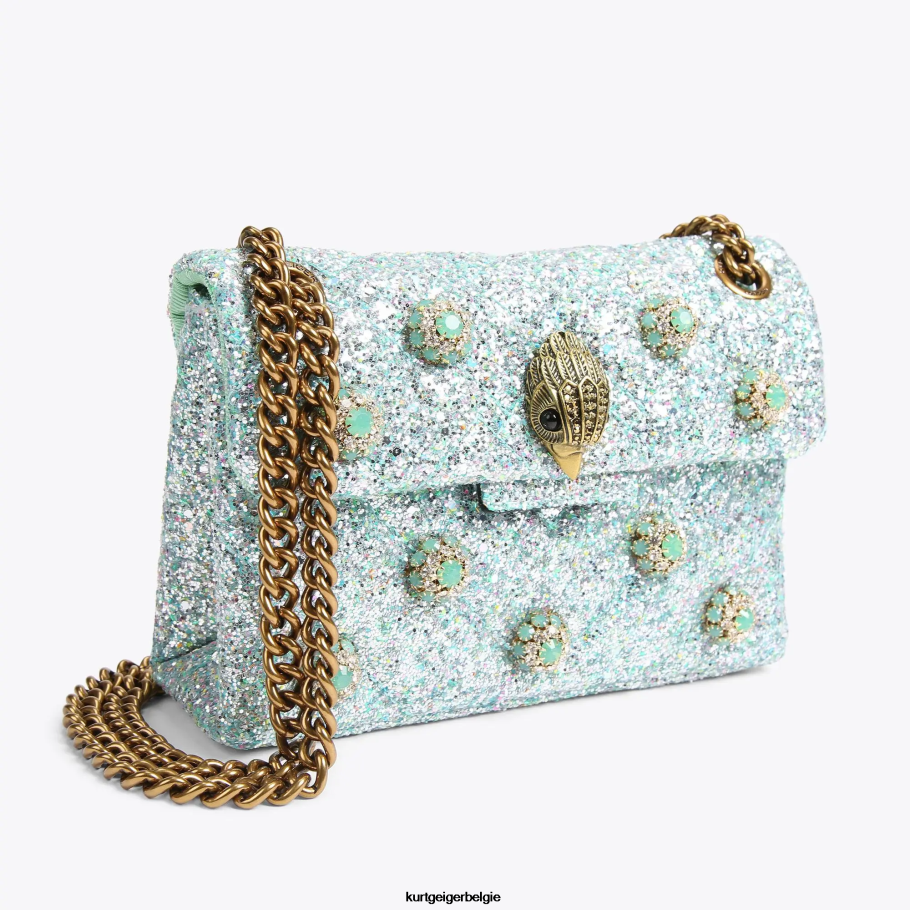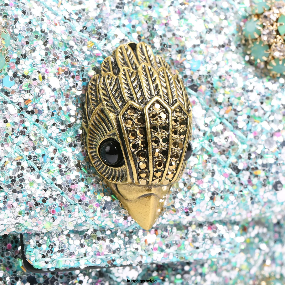 De mini Kensington-tas is gemaakt van een ongecoate lichtblauwe glitter met groene kristallen versieringen. de adelaarskop van antiek koper is voorzien van kristallen en zwarte kraalogen op de voorflap.