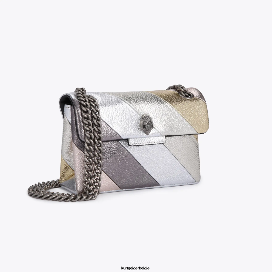 De leren mini Kensington-portemonnee is gemaakt van metallic gelamineerd rundleder met kiezelkorrels en het iconische diagonale, opgenaaide regenboogstreeppatroon. De antieke zilveren adelaarskop is voorzien van ondoorzichtige zilveren kristallen en zwarte kraalogen op de voorflap.