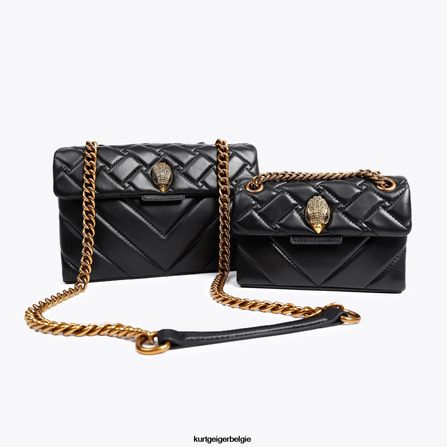 De mini-kensington-tas is gemaakt van zacht lamsleer met overstitch-quilting, waarbij zowel geweven als chevron-patronen worden gecombineerd. De antieke koperen adelaarskop is voorzien van ondoorzichtige koperen kristallen en zwarte kraalogen op de voorflap.