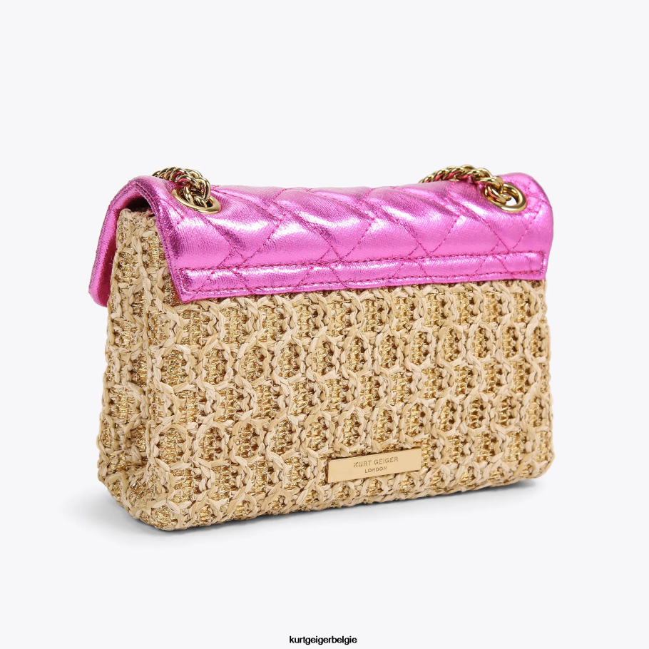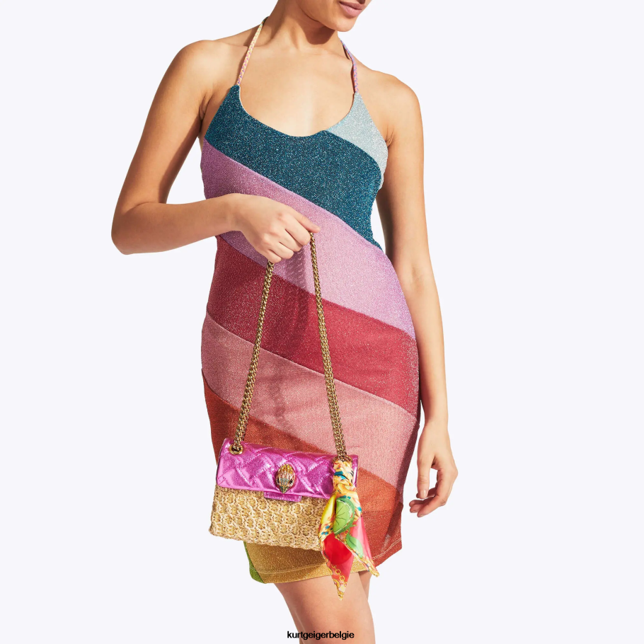 De raffia mini-kensington heeft een gouden raffia-basis met metallic leer en een doorgestikte gewatteerde flap. De gouden metalen adelaarskop is voorzien van regenboogkristallen en zwarte kristallen ogen op de voorflap. er is een afneembare sjaalbedel met print.