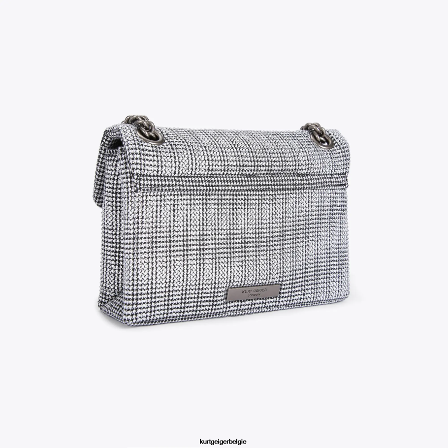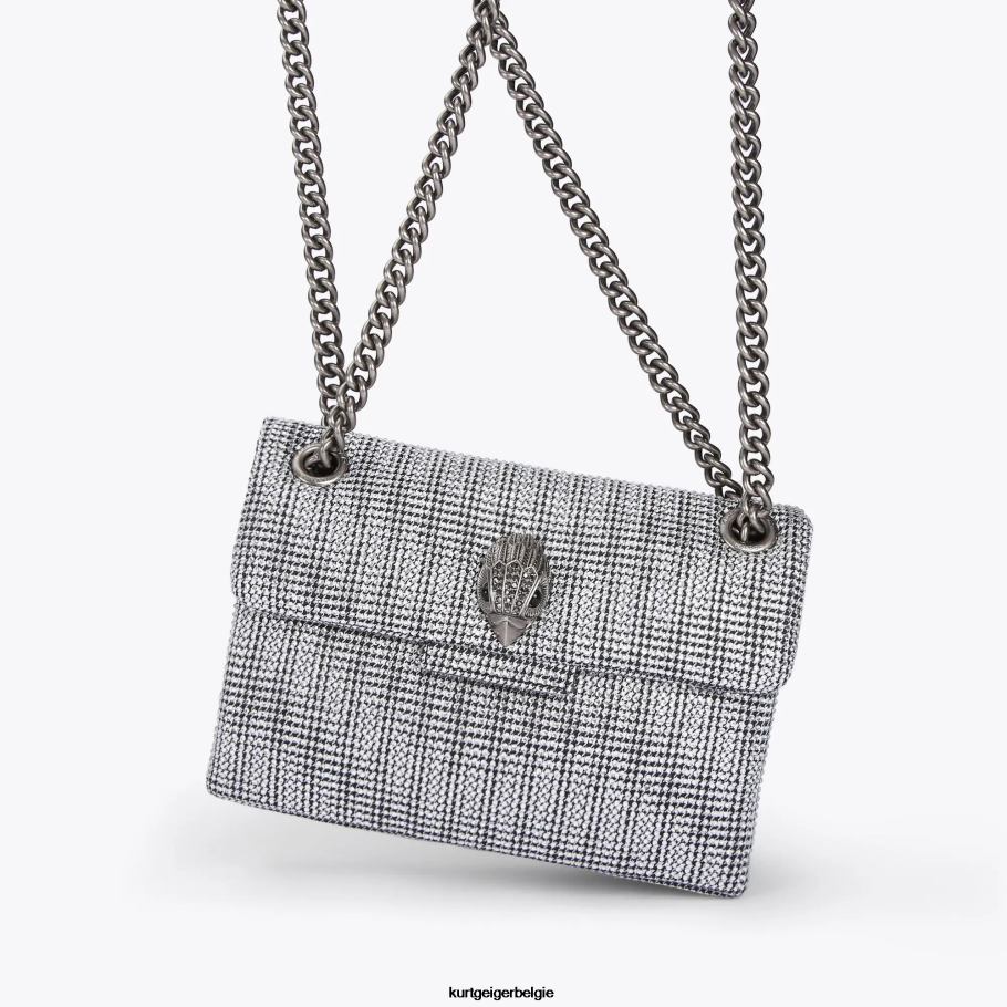 De stof Mini Kensington is gemaakt van een pied-de-poule-stof met daarop ondoorzichtige zilveren kristallen. De antieke zilveren adelaarskop is voorzien van ondoorzichtige zilveren kristallen en zwarte kraalogen op de voorflap.