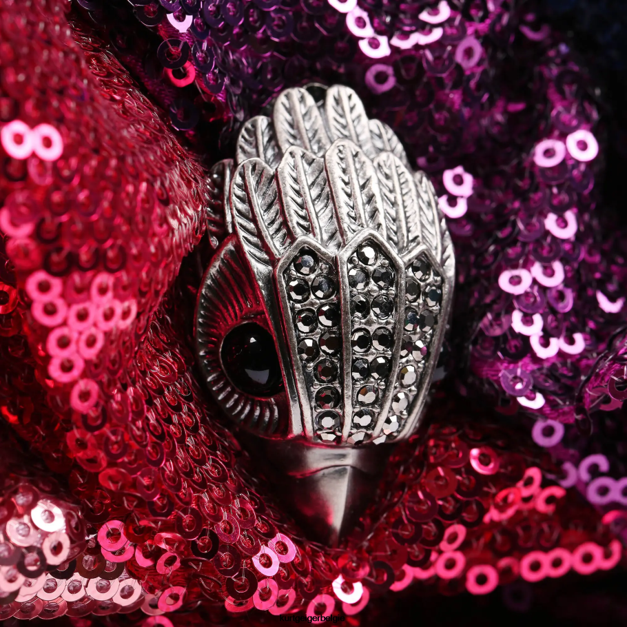 de Mini Kensington met paillettenruches heeft een buitenkant met pailletten in een regenboogstreep. de verouderde zilveren adelaarskop is voorzien van kristallen op de voorflap.