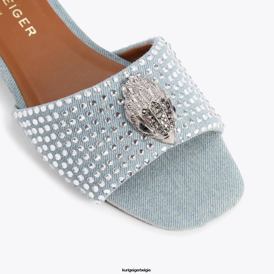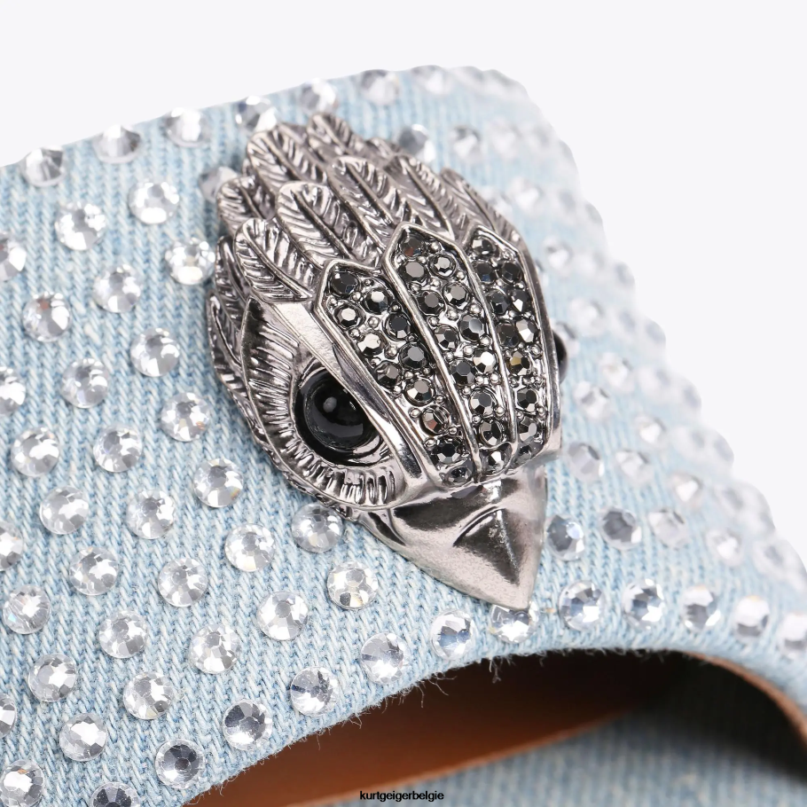 De Kensington platte sandaal, een toevoeging aan de Kensington collectie, is gemaakt van denim. de antieke zilveren adelaarskop is voorzien van kristallen naast grotere kristallen op de band.