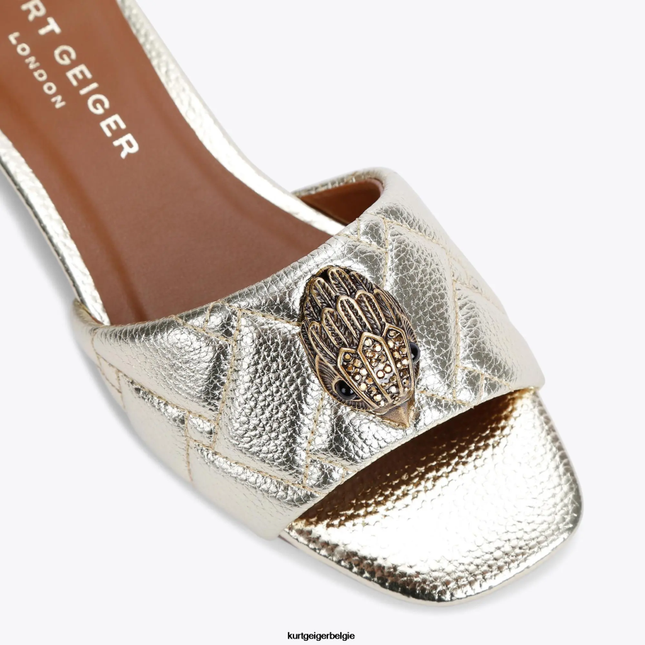 De platte Kensington-sandaal, een aanvulling op de Kensington-collectie, is gemaakt van metallic gelamineerd rundleer met kiezelnerf en doorgestikt doorgestikt in een geweven patroon. de antiek koperen adelaarskop is voorzien van ondoorzichtige koperen kristallen en zwarte kraalogen op de band.