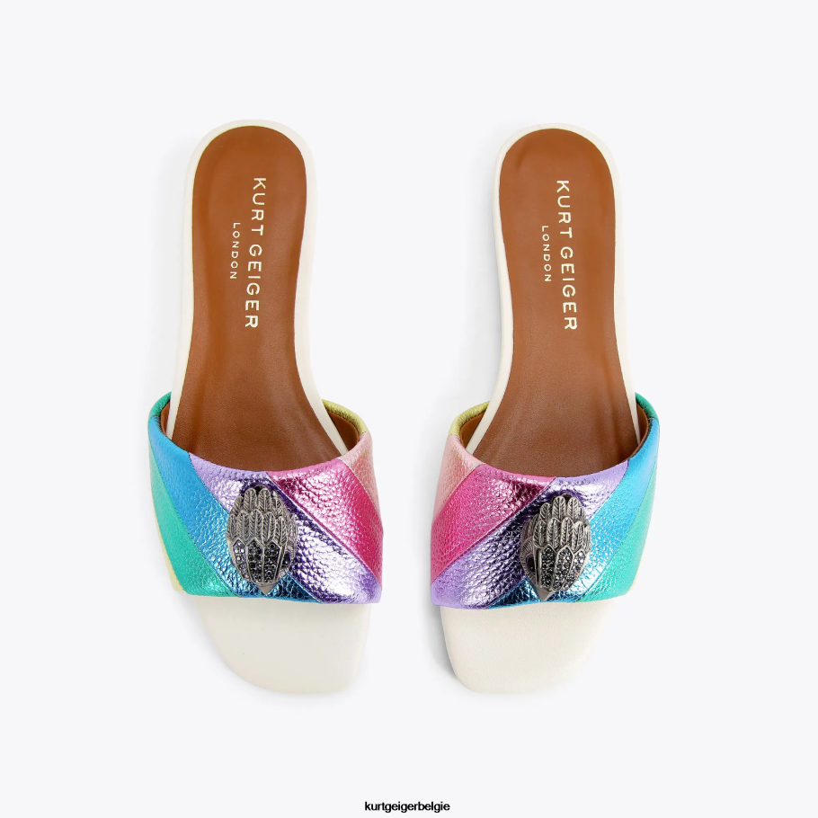 De platte Kensington-sandaal, een toevoeging aan de Kensington-collectie, is gemaakt van pastelleer met het iconische diagonale, opgenaaide regenboogstreeppatroon. de antieke zilveren adelaarskop is voorzien van kristallen en zwarte kraalogen op de band.