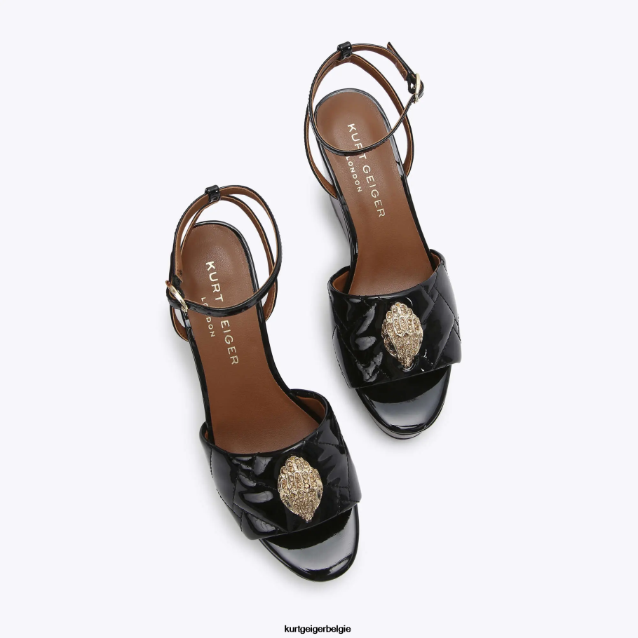 De kensington wedge, een toevoeging aan de iconische kensington-collectie, is gemaakt van lakleer. de gouden adelaarskop is voorzien van koperen kristallen en zwarte kristallen ogen op de gewatteerde riem.