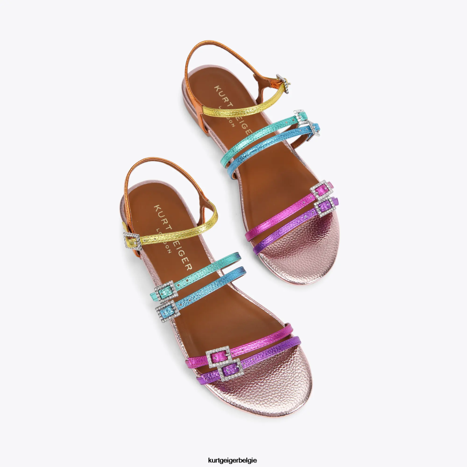 De platte Pierra-sandaal is gemaakt van getextureerd leer in meerdere metallic kleuren over de bandjes. elke band is afgewerkt met een zilveren gesp met juwelen.