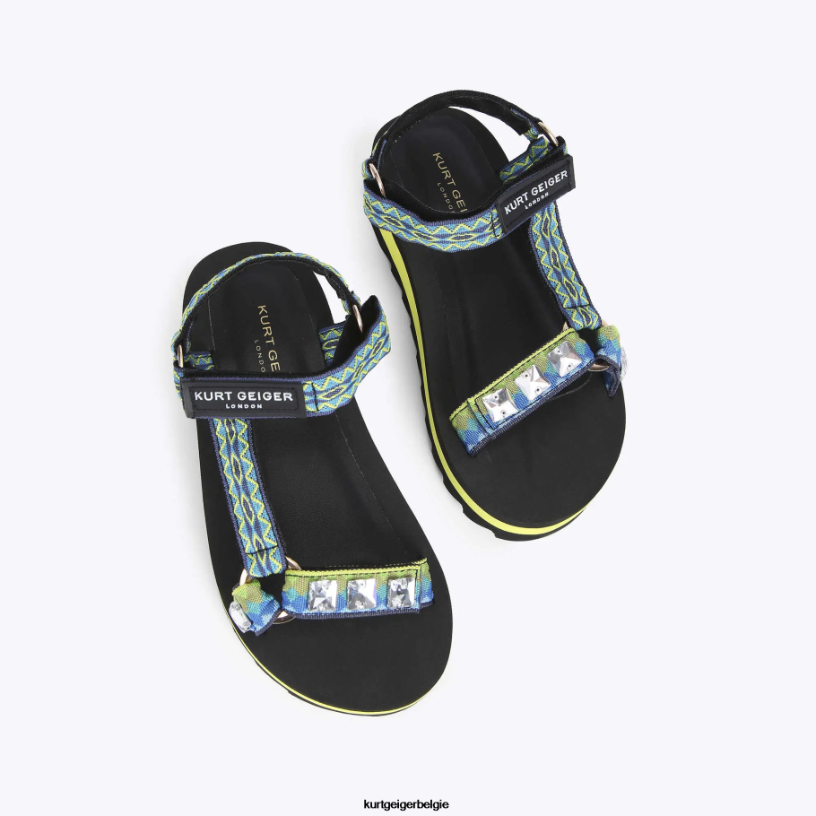 De mini olivia sandalen zijn een geweven sandaal in groen en blauw Azteeks design. de bandjes zijn verbonden met gouden lussen en zijn bedekt met heldere vierkante edelstenen. Het enkelbandje is vastgemaakt met een klittenbandsluiting met het merk en alles zit op een rubberen zool in geel en zwart.