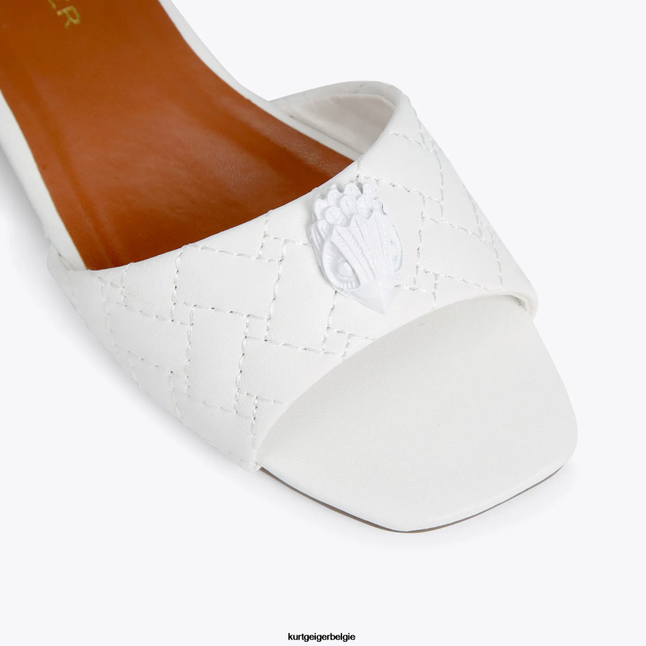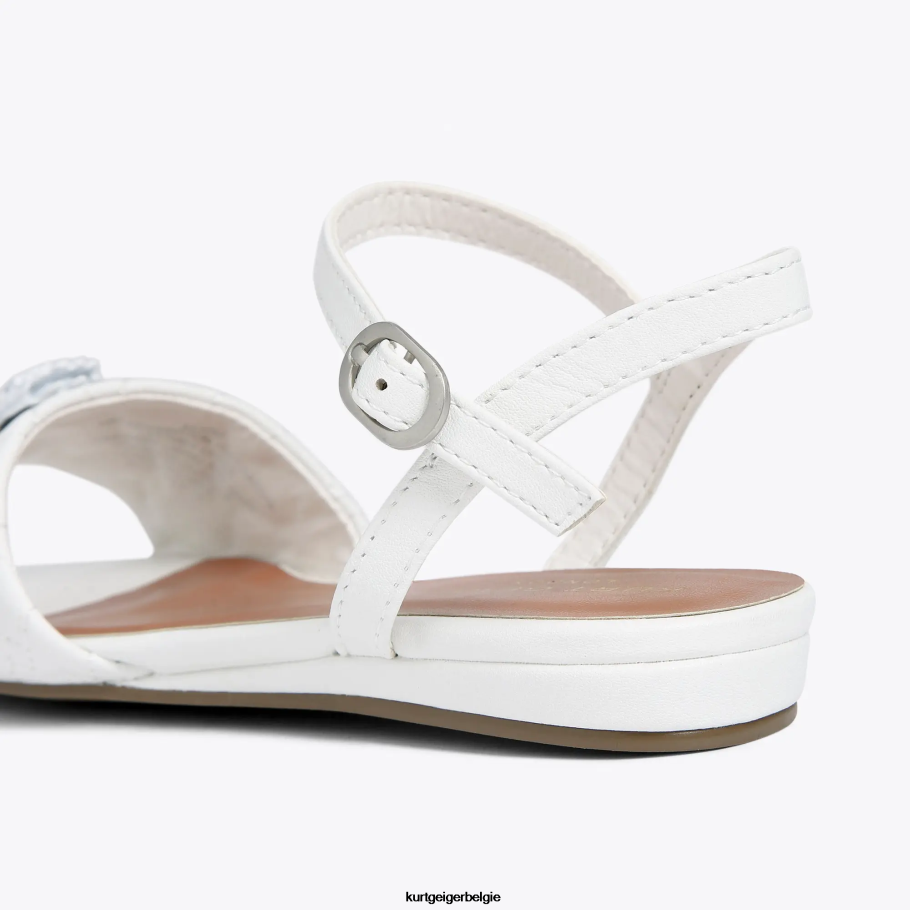 de mini-kensington-sandaal heeft een bovenwerk van wit leer met doorgestikte stiksels over de voorband. de witmetalen adelaarskop is geheel voorzien van veren.