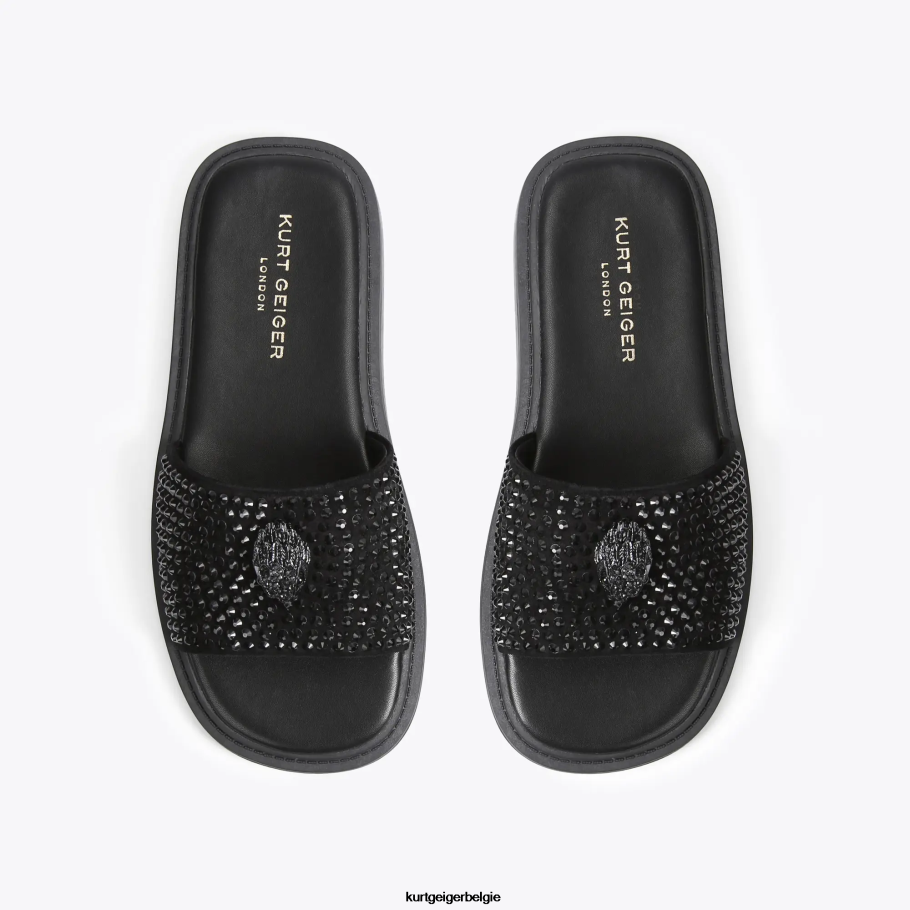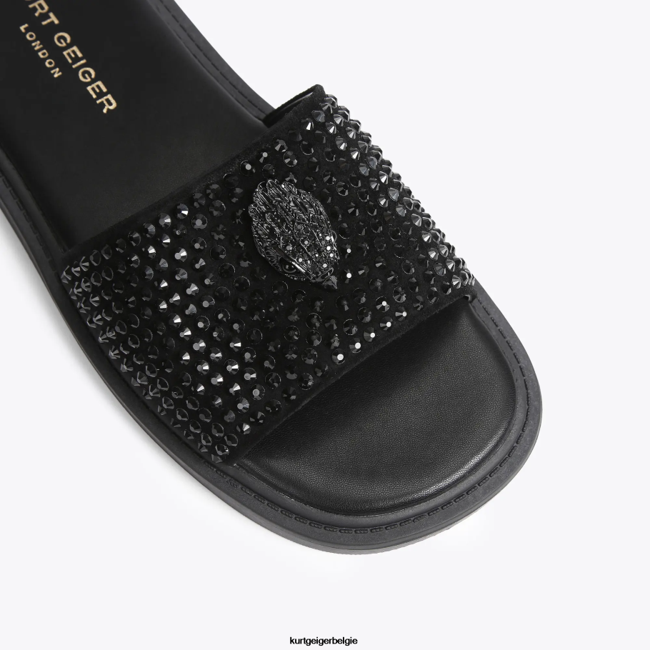 De oscar gem slider-sandalen hebben een suède bandje over de voet met zwarte kristallen versiering. de zwarte adelaarskop is voorzien van kristallen op de riem.