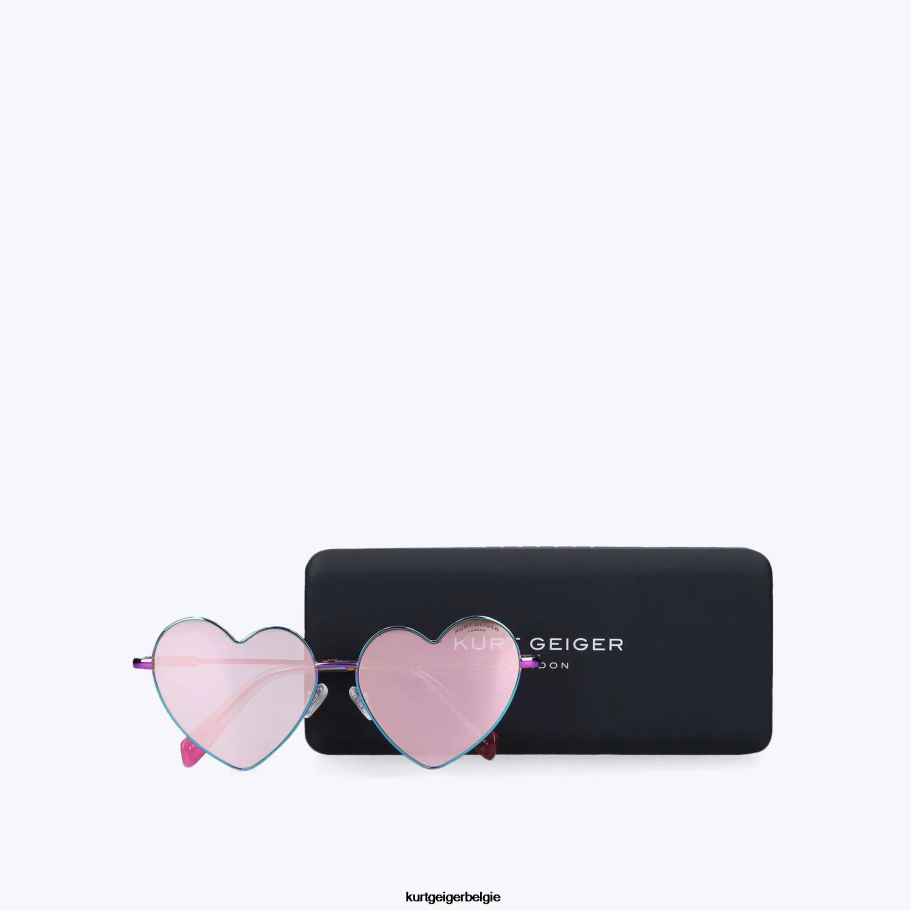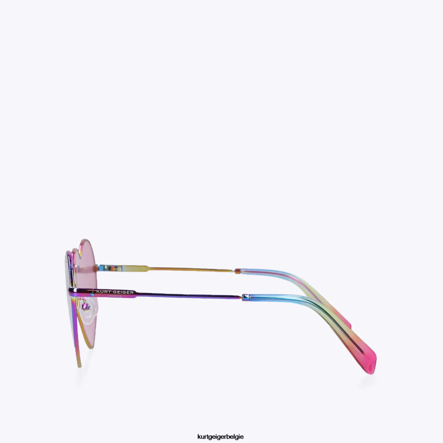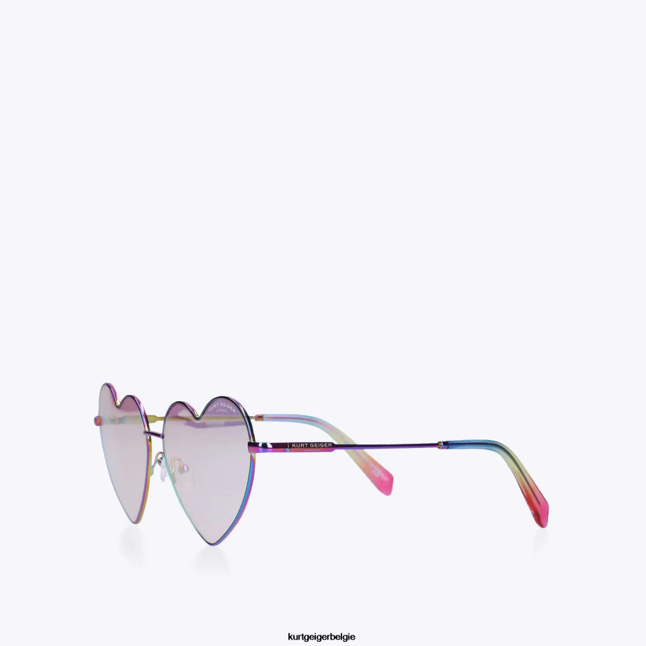 De metalen hartzonnebril is voorzien van twee hartvormige reflecterende lenzen. het metaal is iriserend en verandert in het licht met branding. de armen zijn voorzien van ombre regenboogpootjes voor comfort.